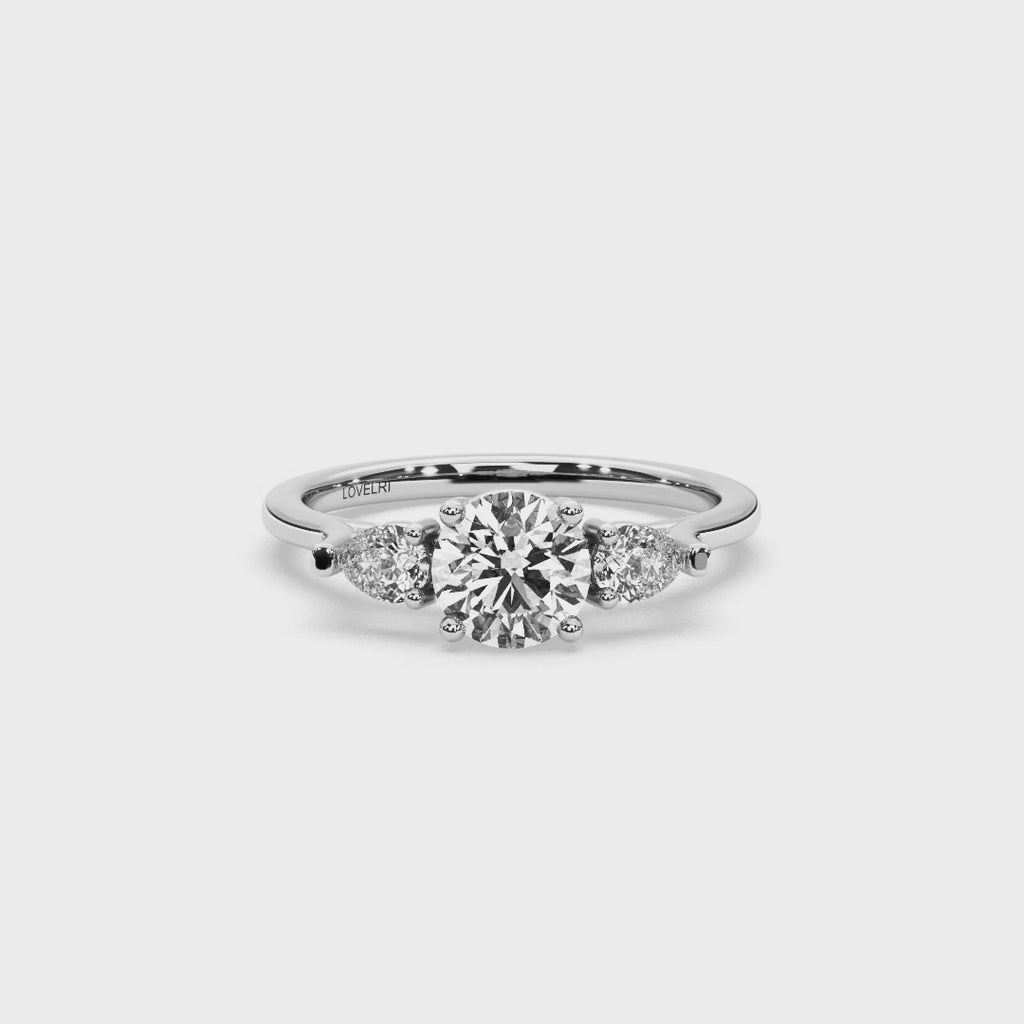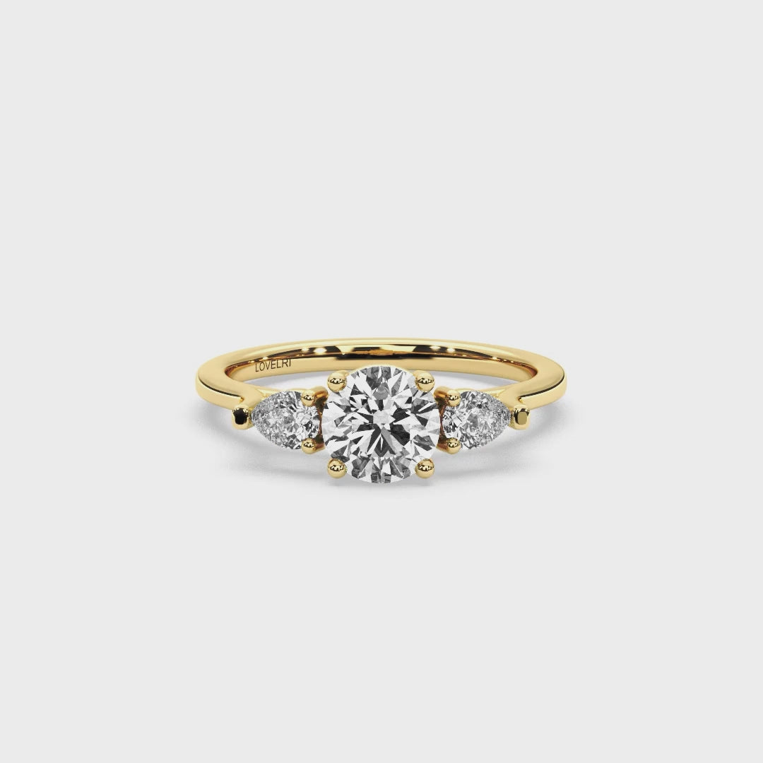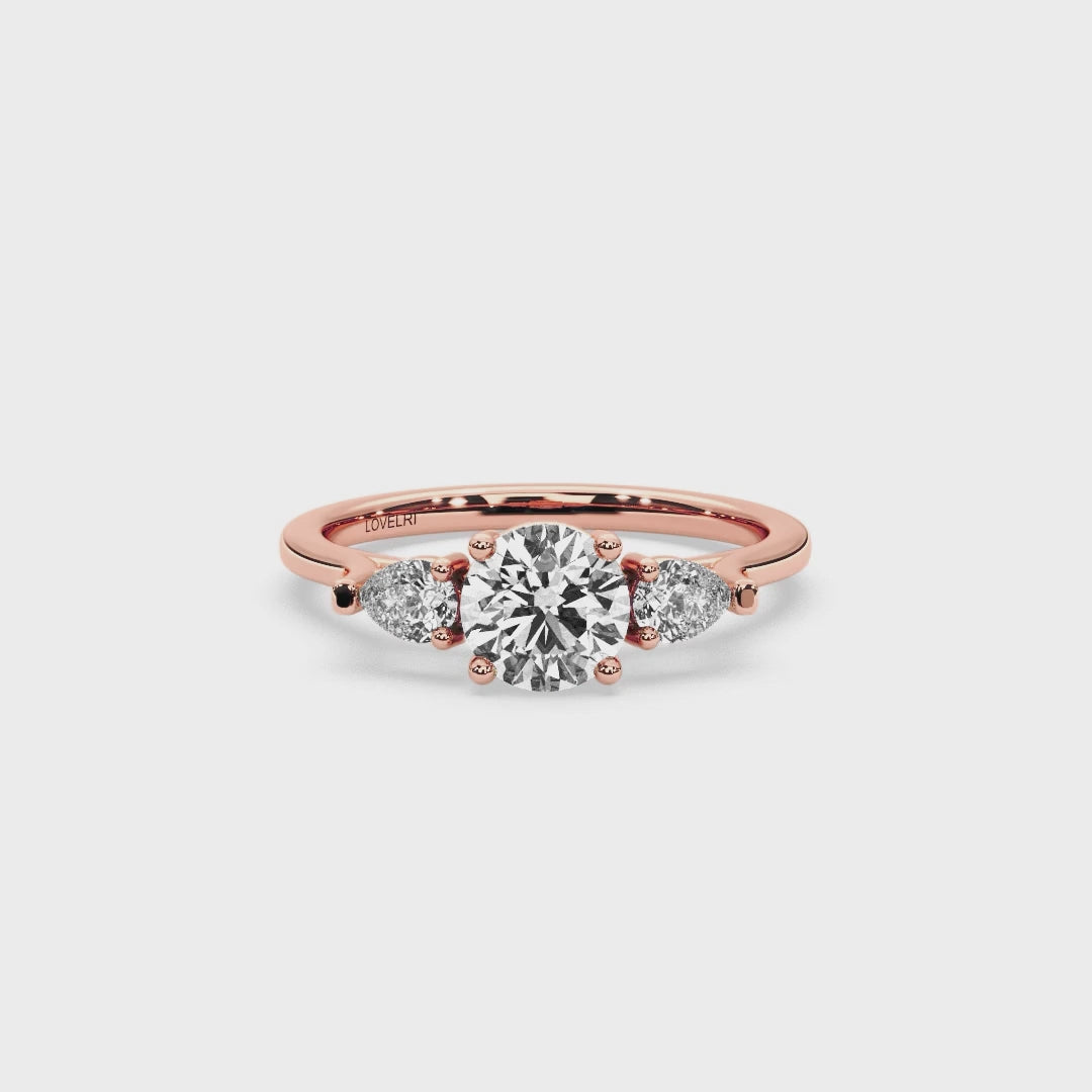 A Trinity Ring with 2 Side Pear Shape Stones Accompanying the Center Stone.
