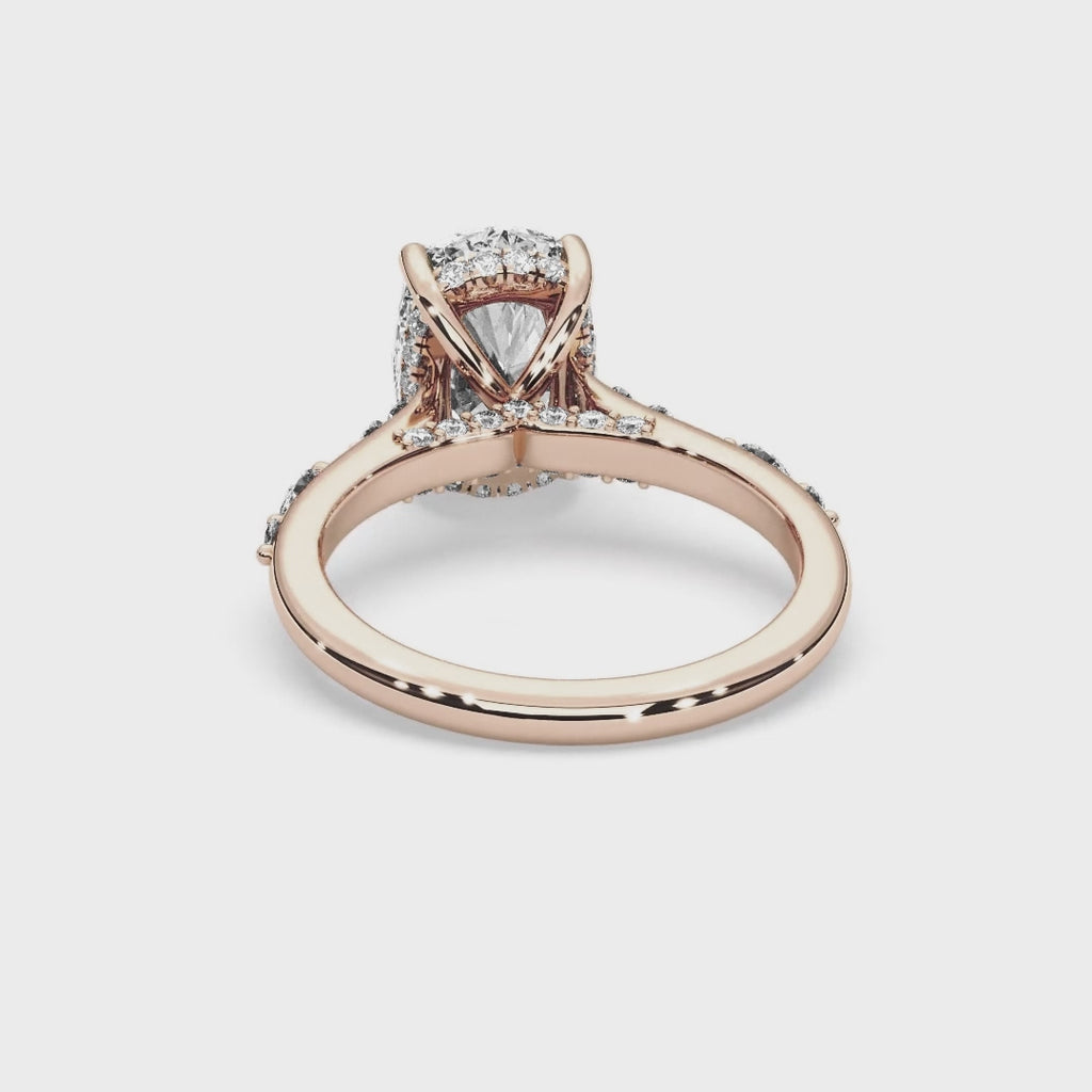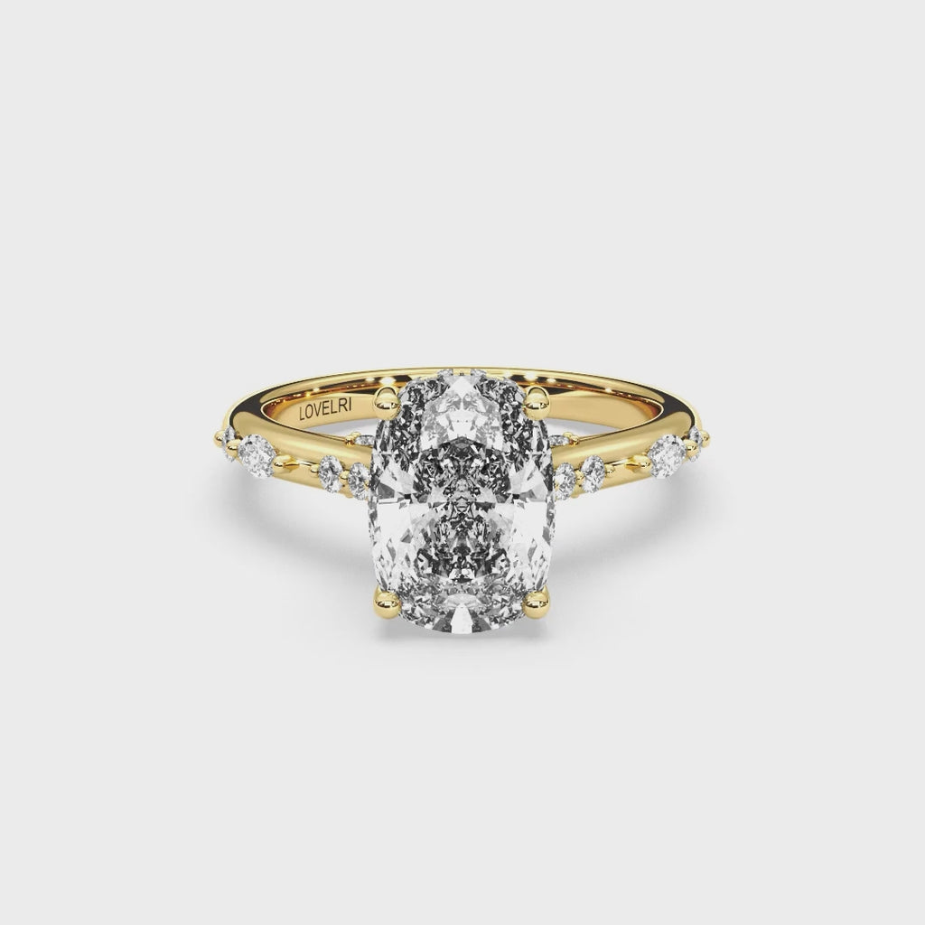 The Sicily Cushion Ring balances gentle curves with architectural form. Its cushion-cut centre diamond rests above a diamond bridge and cathedral shoulders, radiating warmth and brilliance from every angle — a modern heirloom shaped by light and craftsmanship.