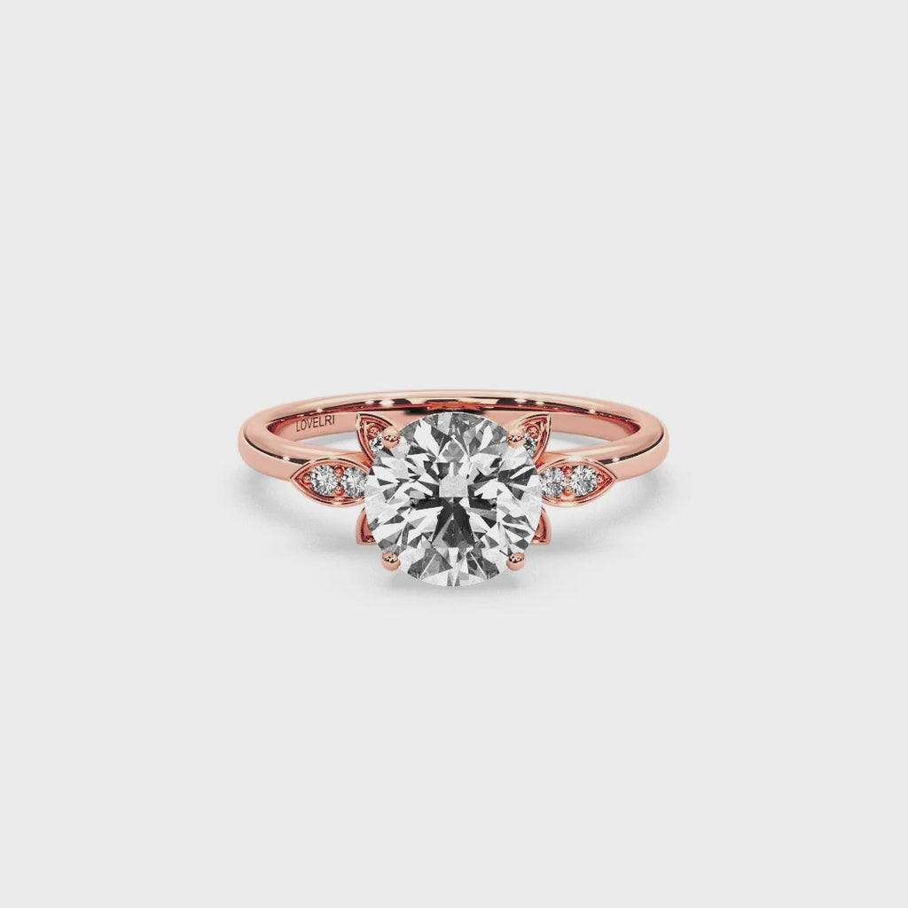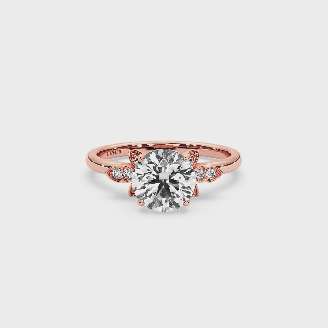 A beautiful round cut stone on a petal setting adorned with side leaves.