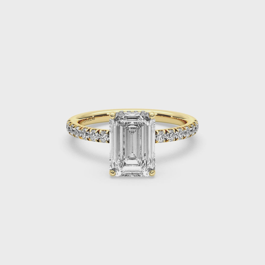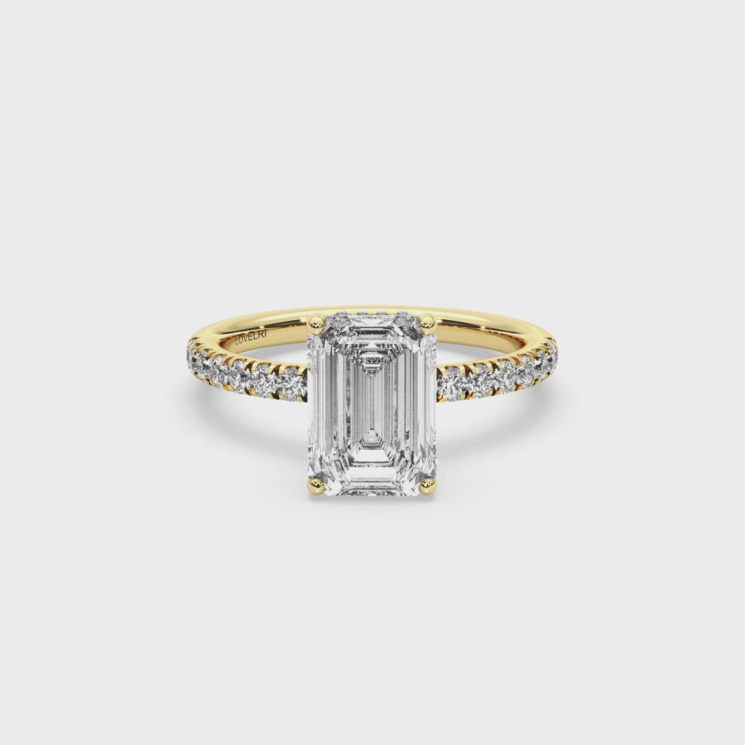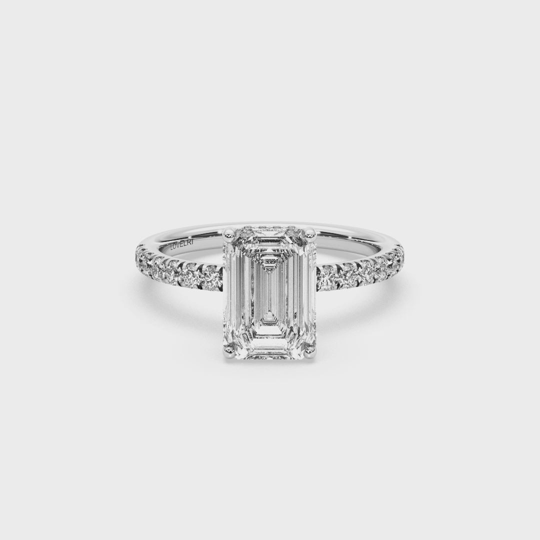 The Capri Ring channels the effortless glamour and sunlit beauty of Italy's coastal gem. Featuring a striking emerald-cut center stone set above a hidden halo, and a pave band that sparkles like light on the Mediterranean, it's refined from every angle. This design captures the feeling of timeless escape - elegant, fresh, and endlessly romantic.