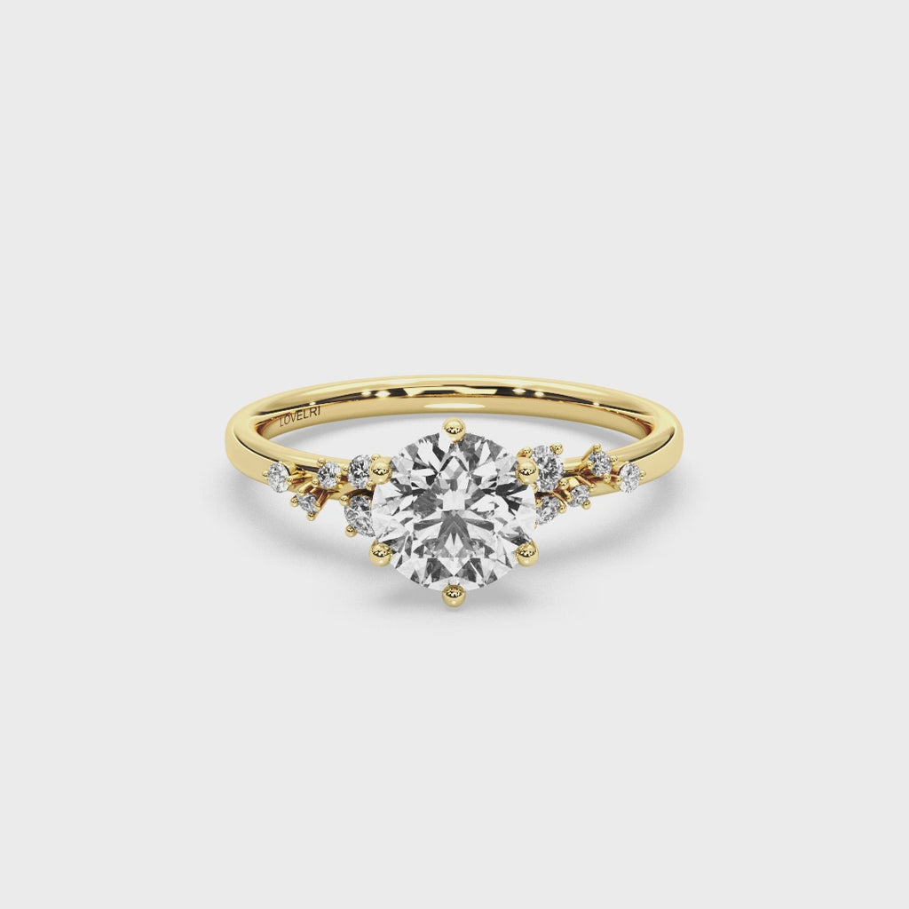 Echoing the dramatic beauty of Italy's Dolomite mountains, the Dolomites Ring features a round center stone secured by six refined prongs and a delicate gallery rail. On each side of the center stone, clusters of small round diamonds resemble rocky peaks kissed by light, adding texture and brilliance. This design captures the balance of rugged majesty and refined charm found in alpine landscapes.