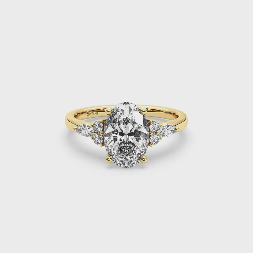 A Sparkling Oval accompanied by 2 round stones and 1 marquise stone on each side.