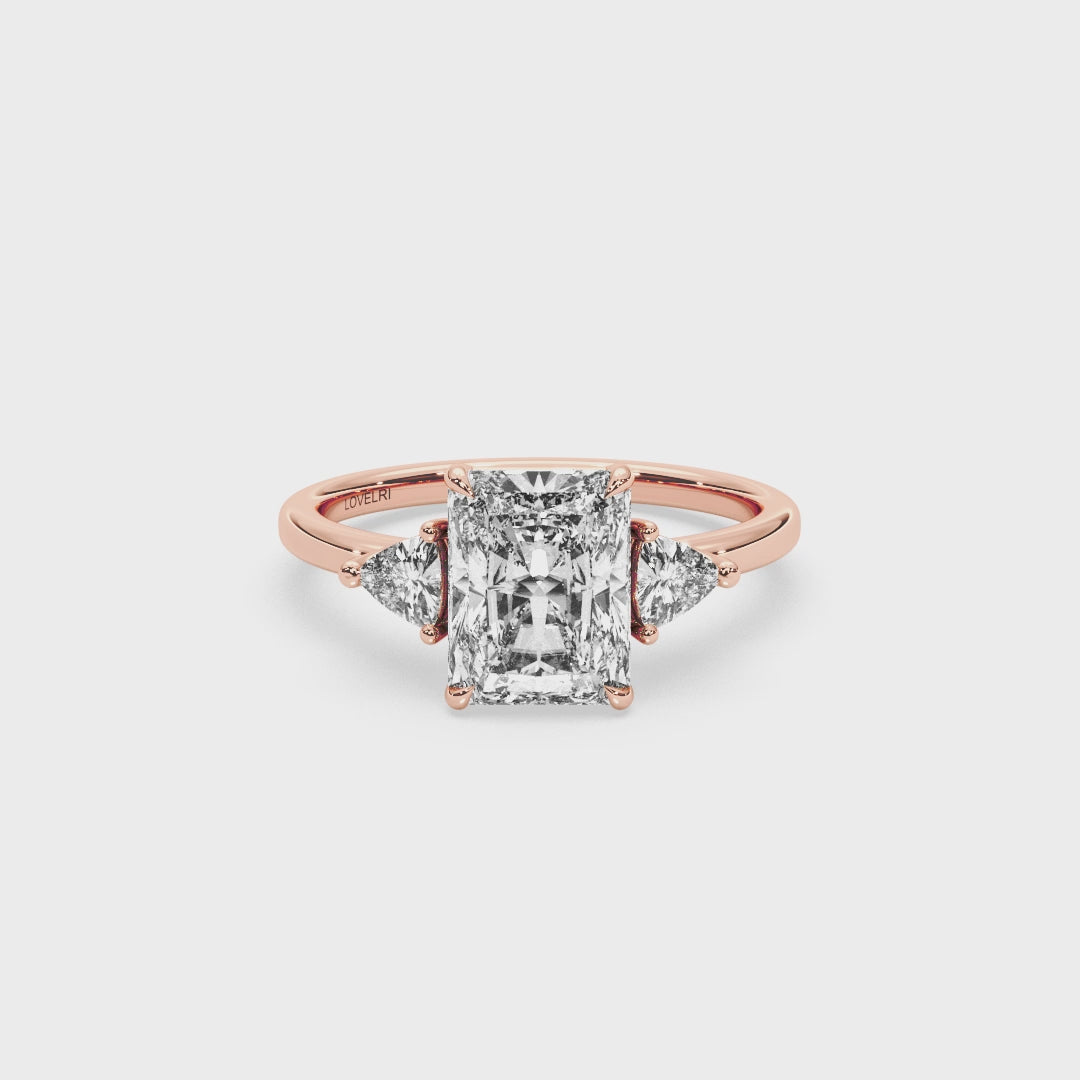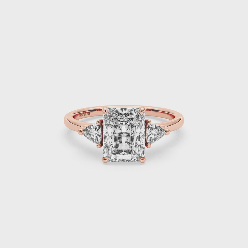 The Fiji Ring is inspired by the vibrant beauty and serene symmetry of the islands of Fiji. A radiant-cut center stone is flanked by two trillion-cut side stones, creating a bold, sunlit silhouette that feels both sculptural and effortless. It's a design that captures the spirit of island elegance - brilliant, balanced, and made to shine from every angle.