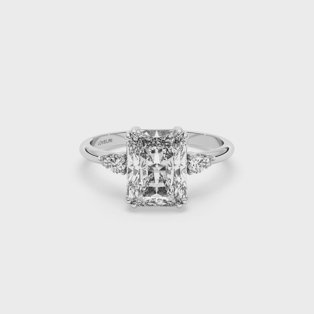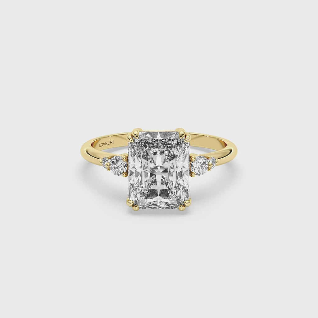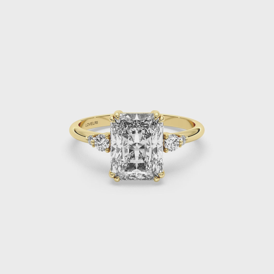 The Bali Ring is inspired by the island’s golden balance of stillness and vitality — the way sunlight dances through temple gates and ripples across quiet waters. A radiant-cut center stone gleams at the heart of the design, secured in a low basket setting that rests close to the finger while allowing light to pour through from every angle. Along the band, tapering round diamonds echo the rhythm of ocean waves meeting the shore — each one smaller than the last, creating a graceful flow of brilliance.